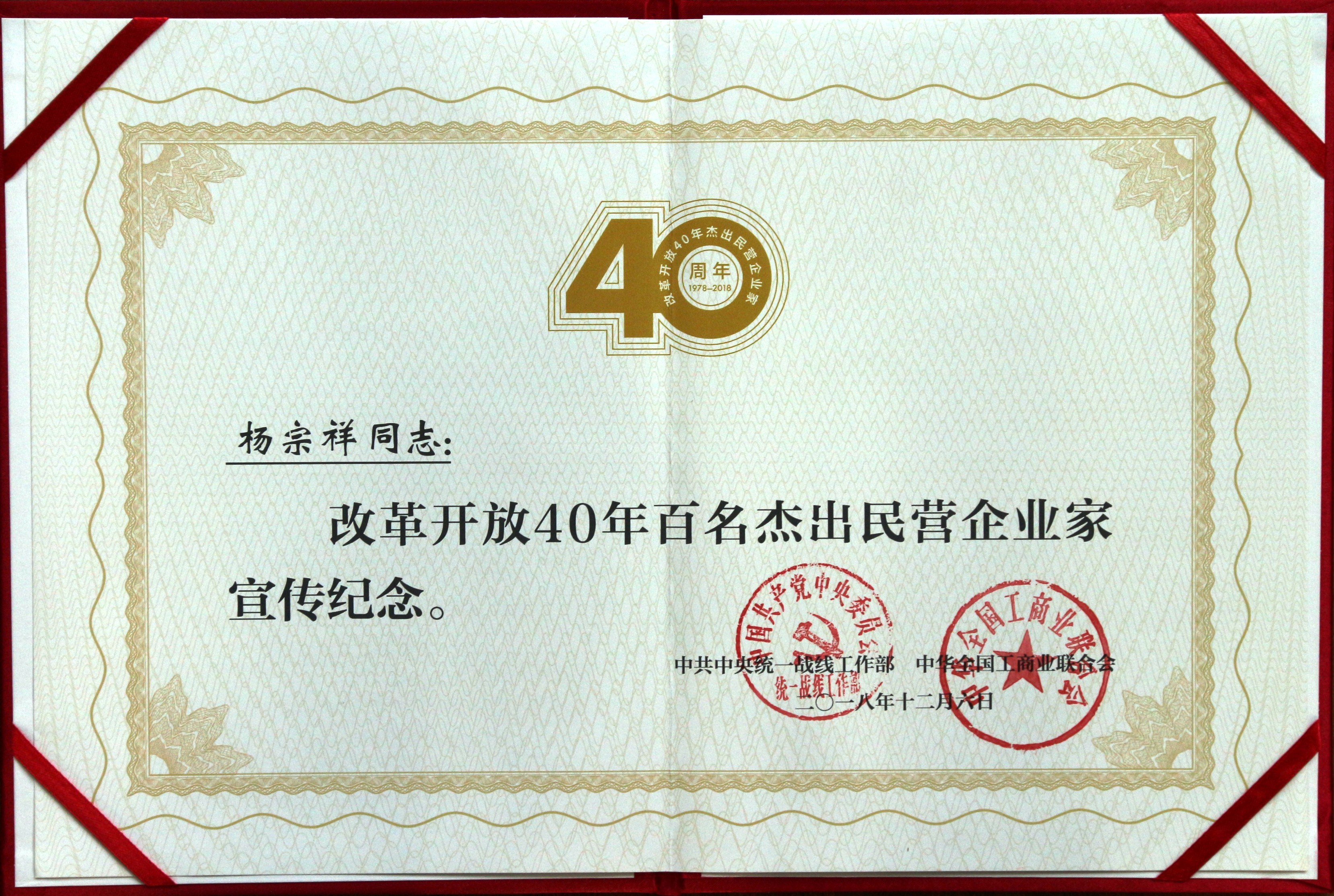 改革開放40年百名杰出民營企業(yè)家(楊宗祥)