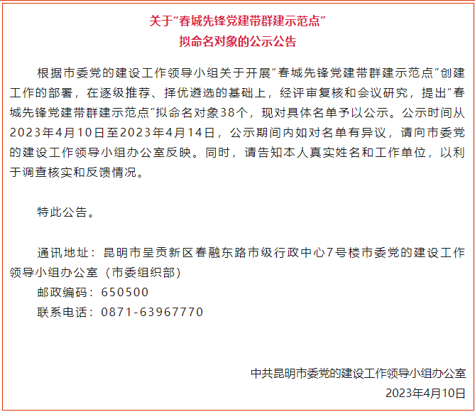 關(guān)于“春城先鋒黨建帶群建示范點”擬命名對象的公示公告根據(jù)市委黨的建設(shè)工作領(lǐng)導小組關(guān)于開展“春城先鋒黨建帶群建示范點”創(chuàng)建工作的部署,在逐級推薦、擇優(yōu)遴選的基礎(chǔ)上,經(jīng)評審復核和會議研究,提出“春城先鋒黨建帶群建示范點”擬命名對象38個,現(xiàn)對具...