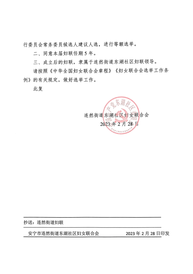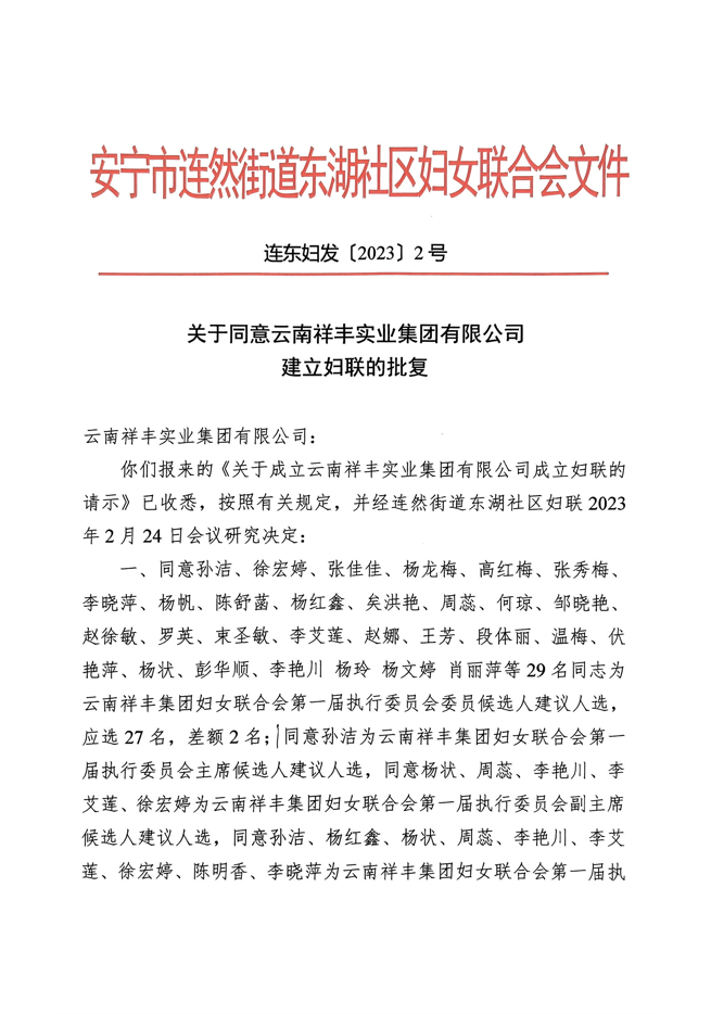 經(jīng)安寧市連然街道東湖社區(qū)婦女聯(lián)合會“聯(lián)東婦發(fā)[2023]1號”、“聯(lián)東婦發(fā)[2023]2號”文件批復,云南祥豐集團于2023年3月2日召開婦女代表大會,正式組建云南祥豐實業(yè)集團有限公司婦女聯(lián)合會。