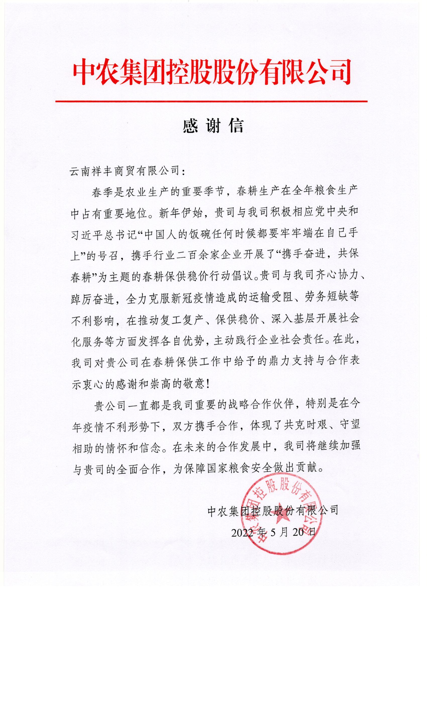 2022年5月20日,云南祥豐商貿(mào)有限公司收到中農(nóng)集團(tuán)控股股份有限公司的感謝信,主要對云南祥豐商貿(mào)有限公司在春耕保供工作中給予的鼎力支持與合作表示感謝。